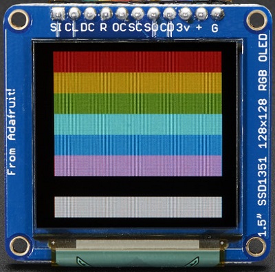 This module defines the interface for the SSD1351 display library. It was tested with the Adafruit 1.5" OLED Display, but should work with any SSD1351 display running in SPI mode.