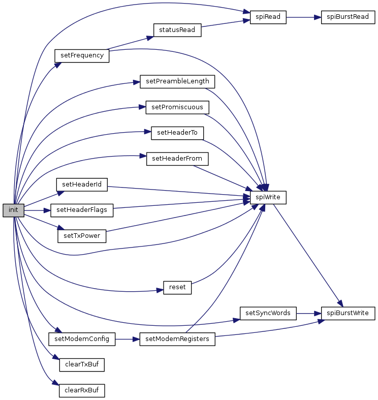 Constructor. You can have multiple instances, but each instance must have its own interrupt and slave select pin. After constructing, you must call init() to initialize the interface and the radio module